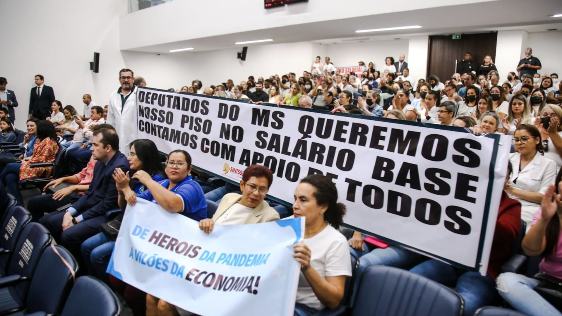 Enfermeiros do Hospital Regional de Mato Grosso do Sul ocuparam o plenário da Assembleia Legislativa, nesta terça-feira (27), para pedir apoio dos deputados estaduais no avanço da aplicação do piso salarial. Com faixas e cartazes, a categoria pediu atenção da Casa de Leis para efetivação