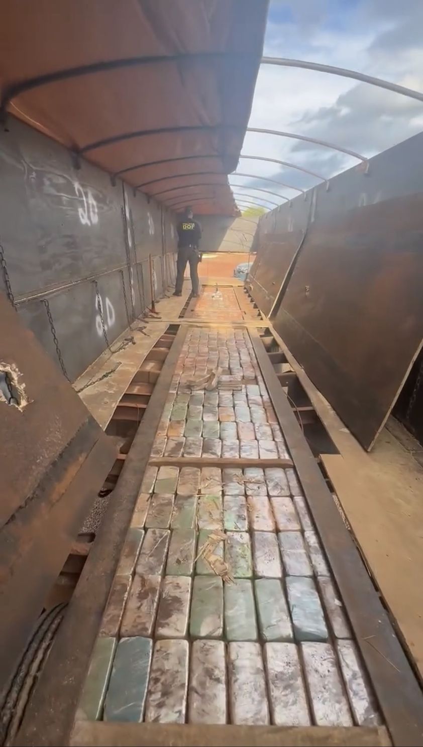 No entanto, durante a inspeção minuciosa, os agentes perceberam uma modificação no assoalho do reboque, que escondia pacotes prensados com a droga. O motorista, que não forneceu explicações sobre o ilícito, foi preso no local.