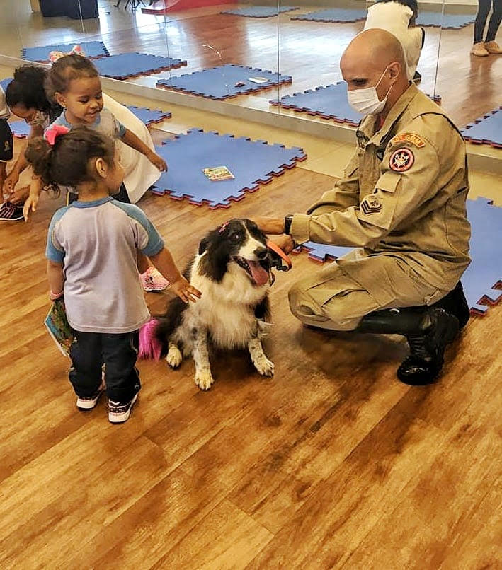 Tomando os devidos cuidados e seguindo os protocolos de segurança contra disseminação do Coronavírus, militares que já foram vacinados visitaram uma escola com a cadela Channel para falar um pouco da profissão Bombeiro Militar e o trabalho que é realizado com os cães.