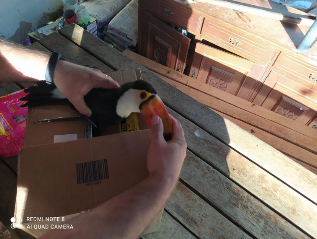 Policiais Militares Ambientais de Corumbá receberam comunicado de pessoas que passavam pela rua América que é bastante movimentada no centro da cidade, de que um animal silvestre da espécie Ramphastos toco (tucano) estaria à margem da rua e não conseguia levantar voo e, por isso, com riscos de ser atropelado ontem (18) à tarde.