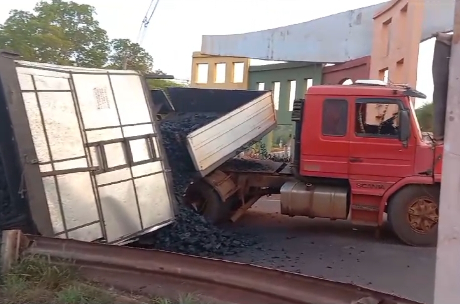 Hoje às 17:10 h houve um tombamento de carreta com carregamento de carvão, na entrada de Corumbá e Ladário, no Portal.