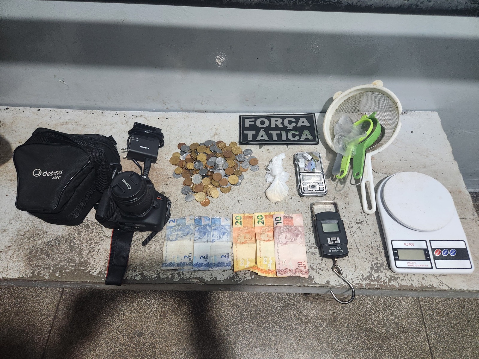 Também foi localizada uma balança de precisão, peneiras com vestígios de pasta base, uma quantia em dinheiro, e um aparelho de celular de cor branca, que não foi informado sua origem.