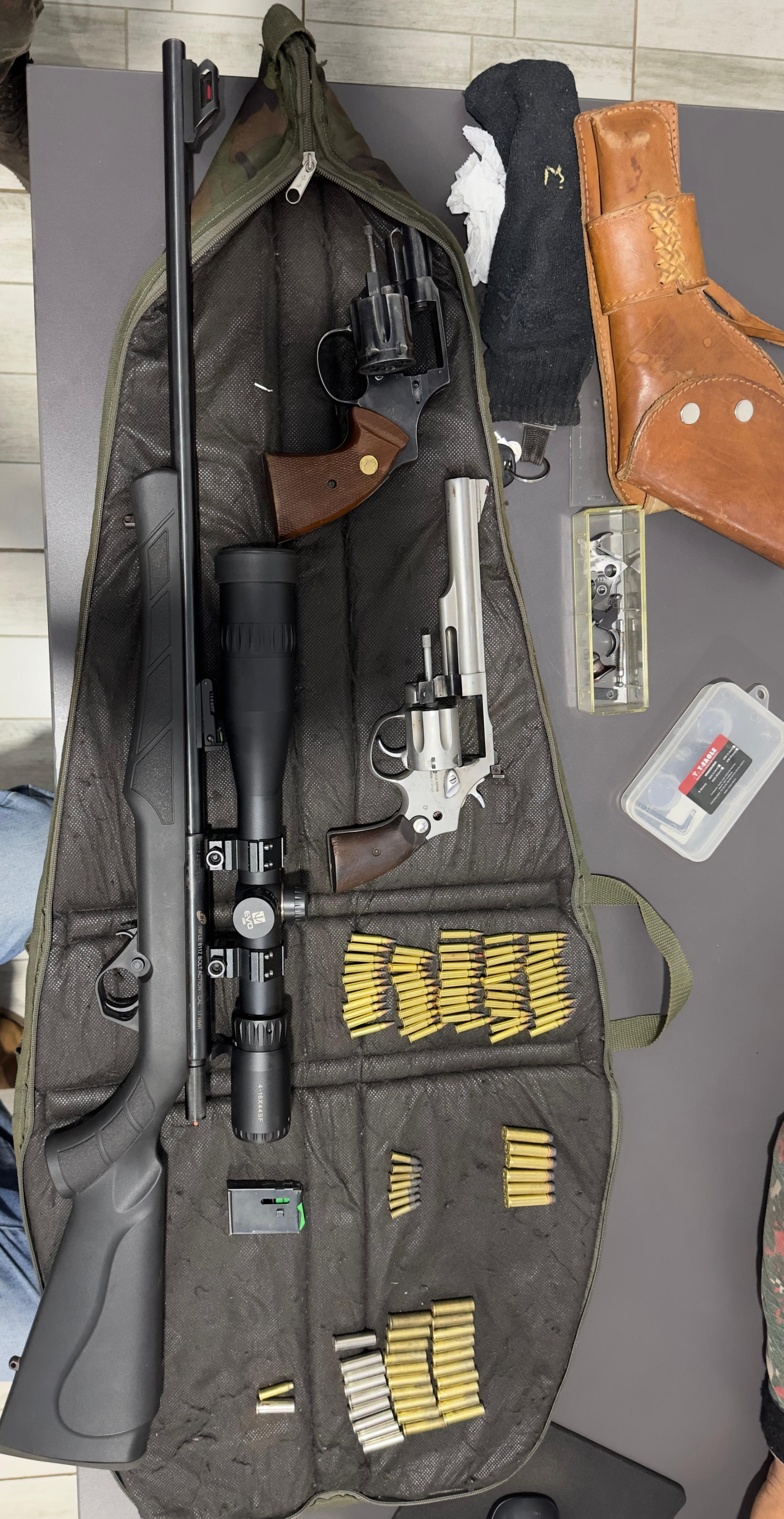 Ao abordar o veículo, os policiais questionaram o condutor sobre a presença de armas no interior da caminhonete. O condutor confirmou que estava de posse de armamento. Durante a vistoria no veículo, foram encontradas três armas de fogo: duas armas longas de calibres .22 e .17, além de um revólver Magnum calibre .357, acompanhado de seis munições intactas e outras 29 cápsulas do mesmo calibre.